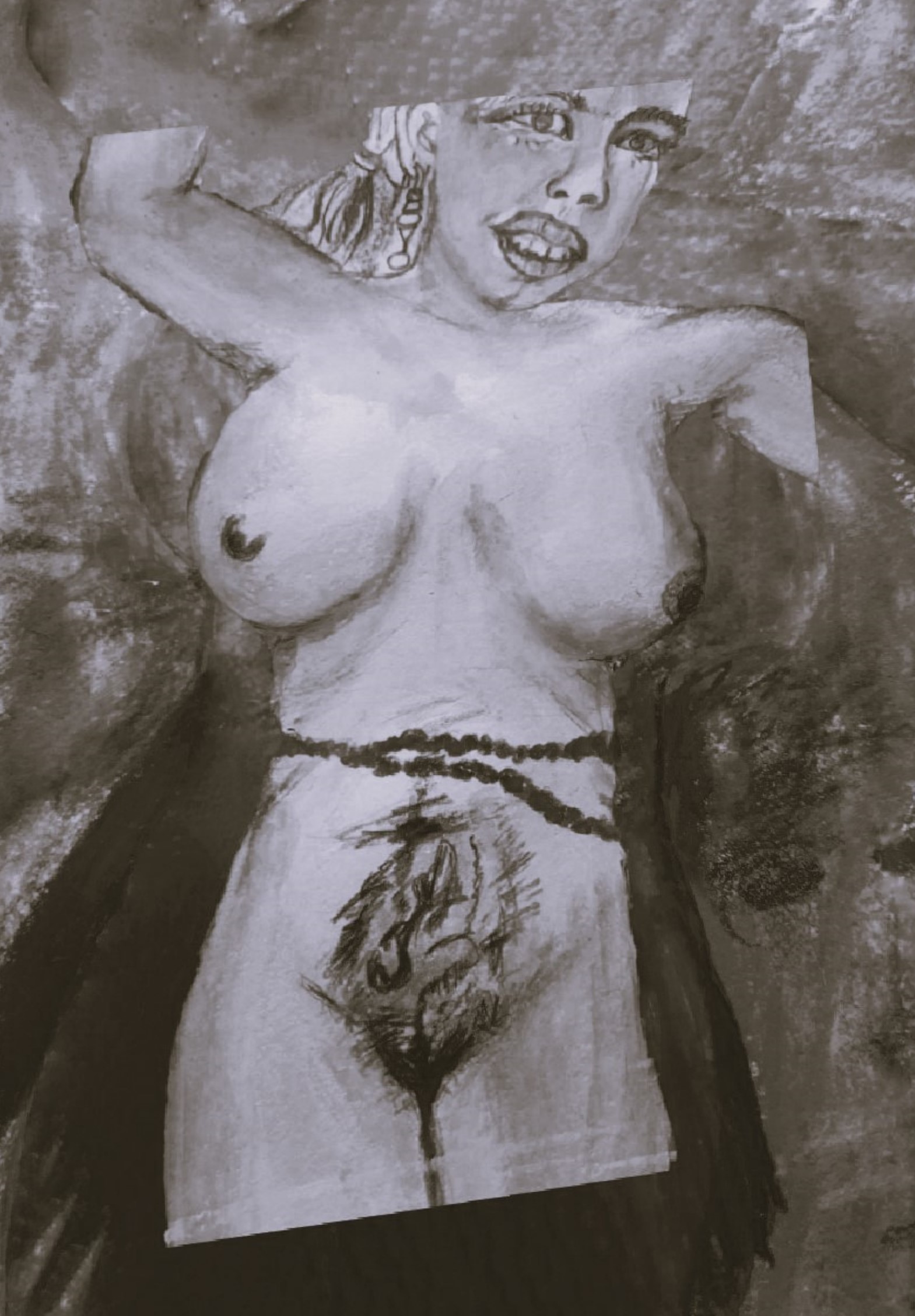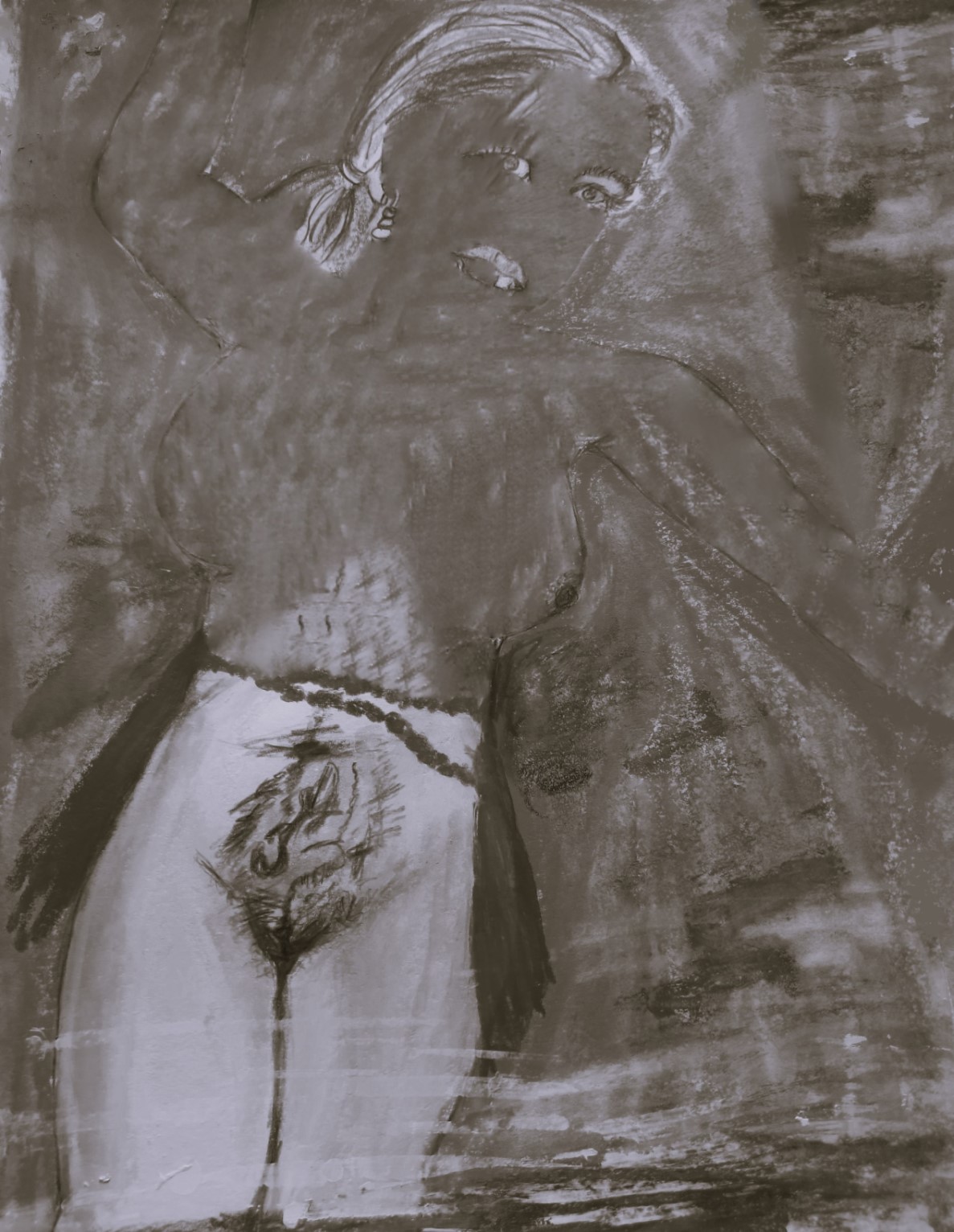 Elle ne surgit pas. Elle se révèle. Peut-être était-elle là depuis toujours. Son pas ne trouble pas la mousse, son regard ne cherche rien : il offre. Elle est calme, douce, presque humide de présence. Sa robe, en velours café, absorbe la cascade comme un souffle ancestral. Chaque goutte devient prière sur l’étoffe vibrante.